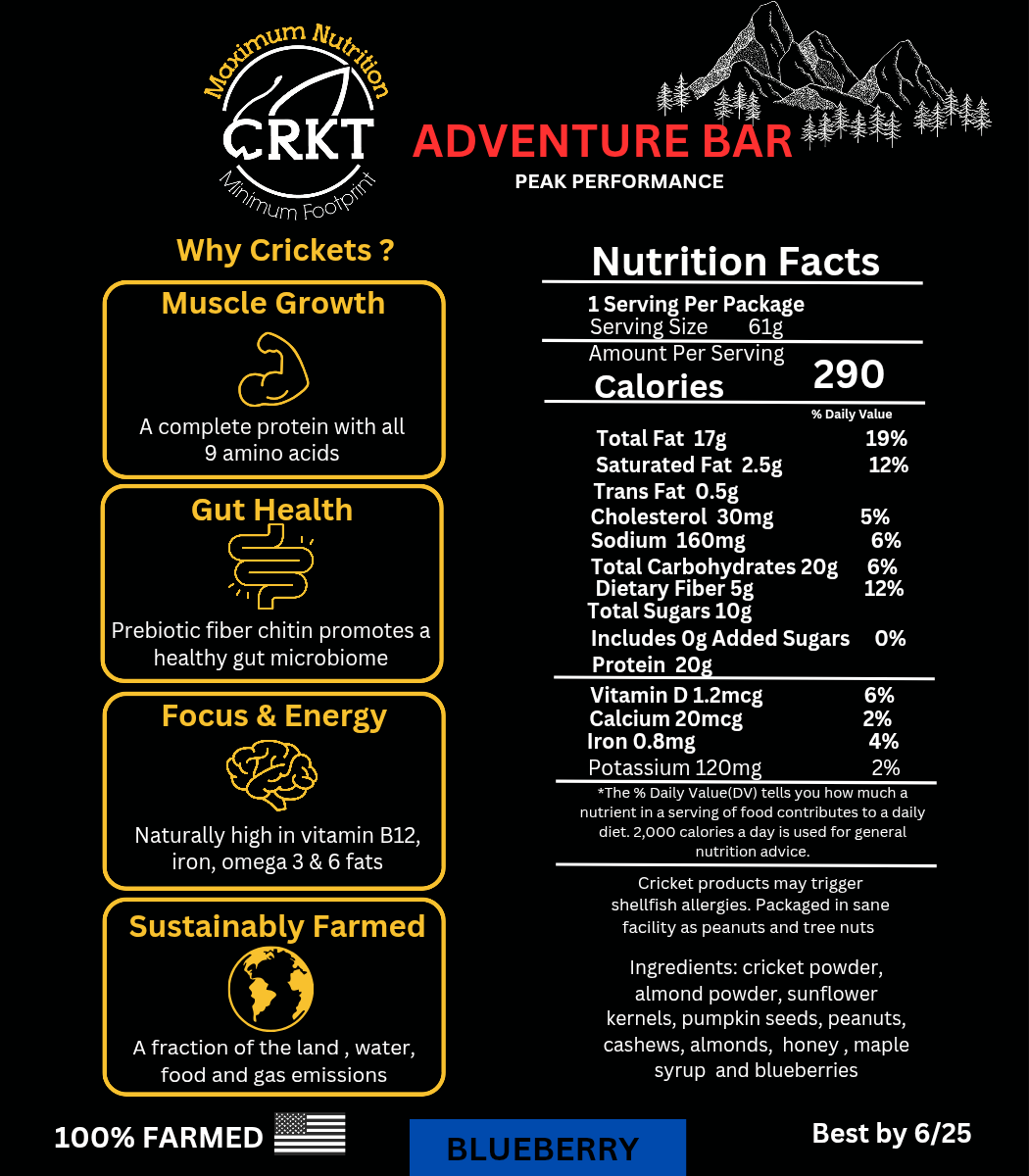 All natural ingredients, cricket protein based bars. To fuel your body for any adventure .