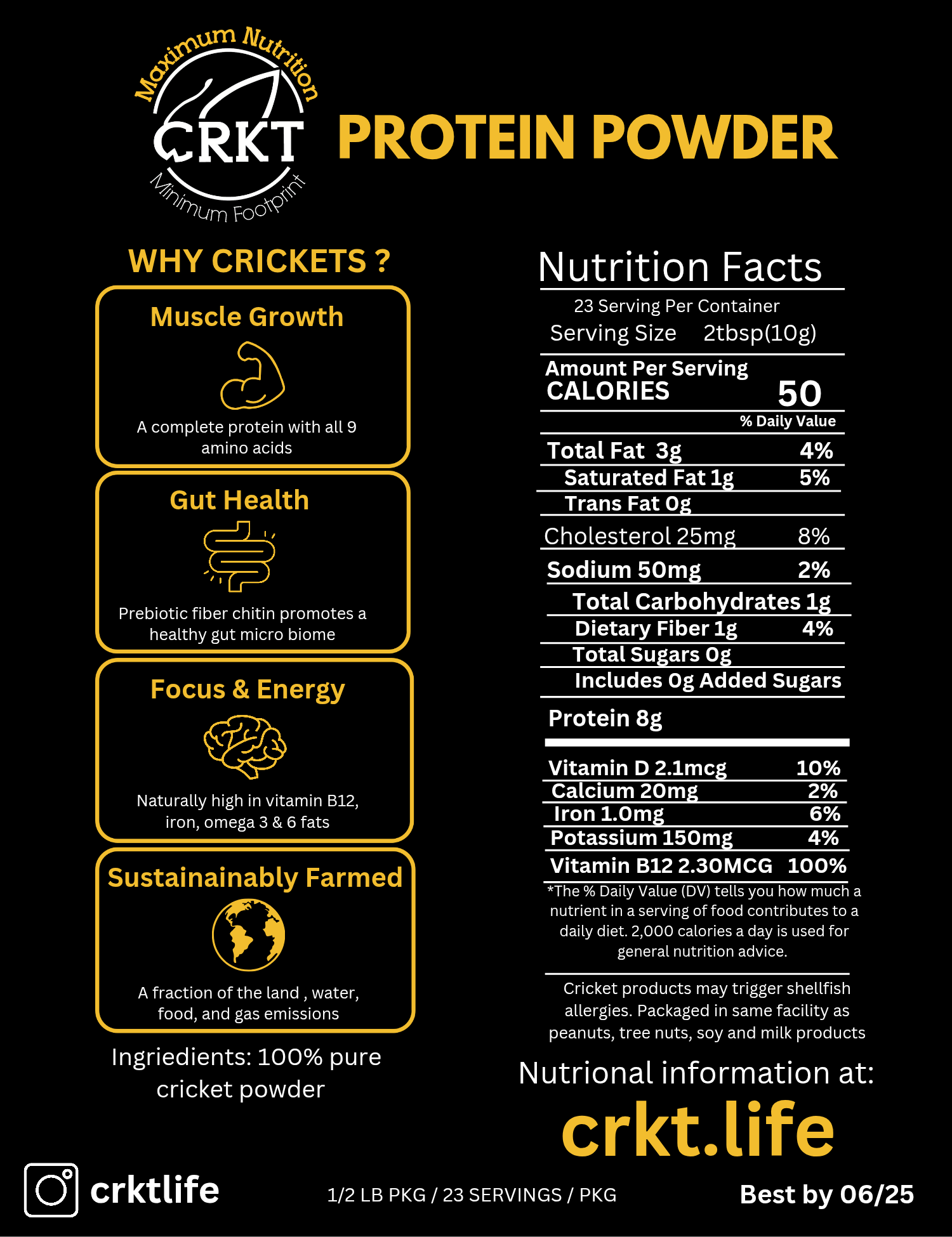 1/2 pound resealable bag of our delicious, sustainable, unflavored, 100% natural cricket protein powder.